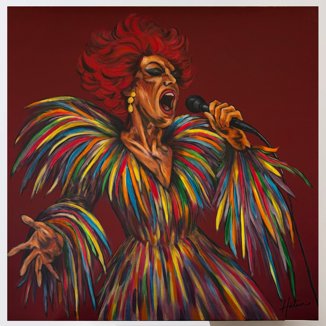 “Diva” tablosu, sahnede tüm varlığıyla parlayan, sesini haykırırken rengini de dünyaya yayan o güçlü ruhun resme yansımasıdır.